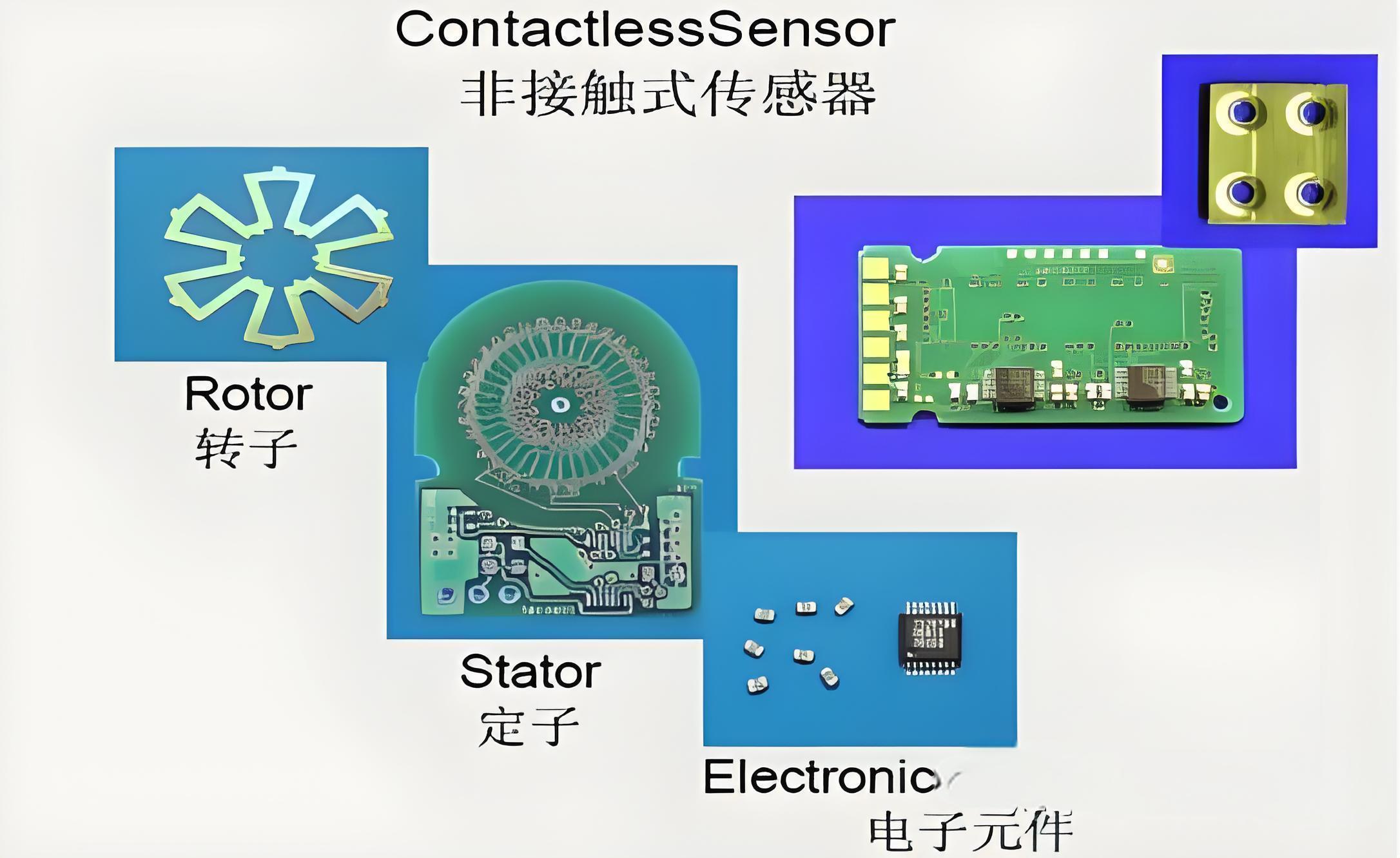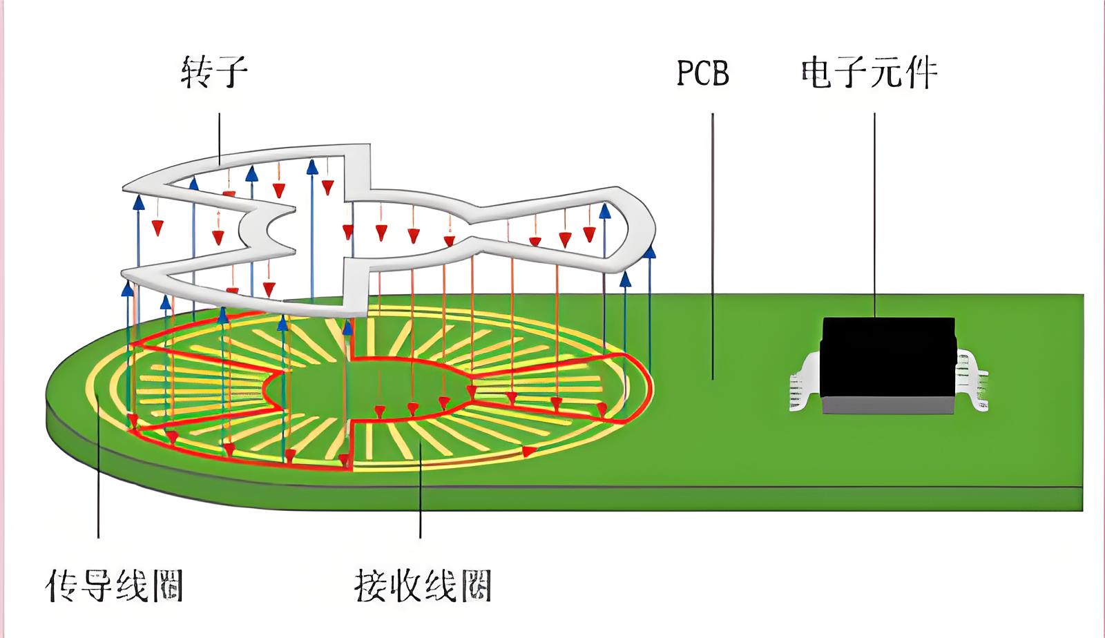 - 交流电流从激励线圈上流过,围绕着转子导电回路产生一个电磁场,产生的交流感应电流流经转子,反过来又产生一个反作用于接收线圈的电磁场。根据转子的位置在接收线圈上生成感应电压,并由电子元件进行测定